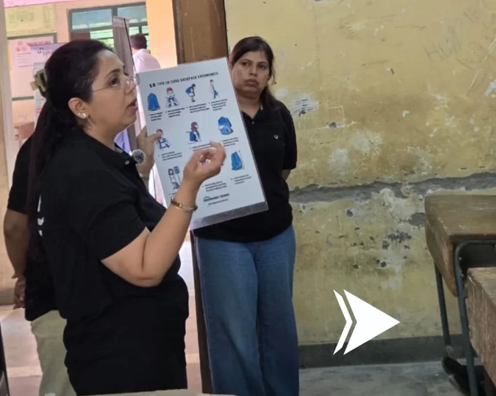 The physiotherapist provides instruction to students on neck and back stretching exercises for muscle relaxation, proper sitting and standing posture, and techniques for lifting heavy objects, as well as the correct way to carry bags using both shoulders. Additionally, the physiotherapy team assesses school staff and parents who report symptoms such as low back pain, shoulder joint pain, knee pain, and other joint-related issues, and encourages them to schedule follow-up sessions at the center.
