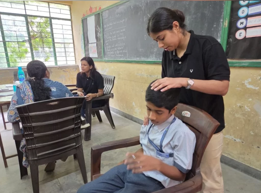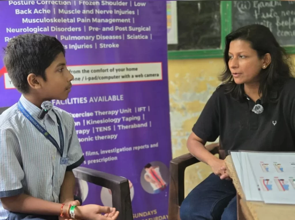 The physiotherapist provides instruction to students on neck and back stretching exercises for muscle relaxation, proper sitting and standing posture, and techniques for lifting heavy objects, as well as the correct way to carry bags using both shoulders. Additionally, the physiotherapy team assesses school staff and parents who report symptoms such as low back pain, shoulder joint pain, knee pain, and other joint-related issues, and encourages them to schedule follow-up sessions at the center.