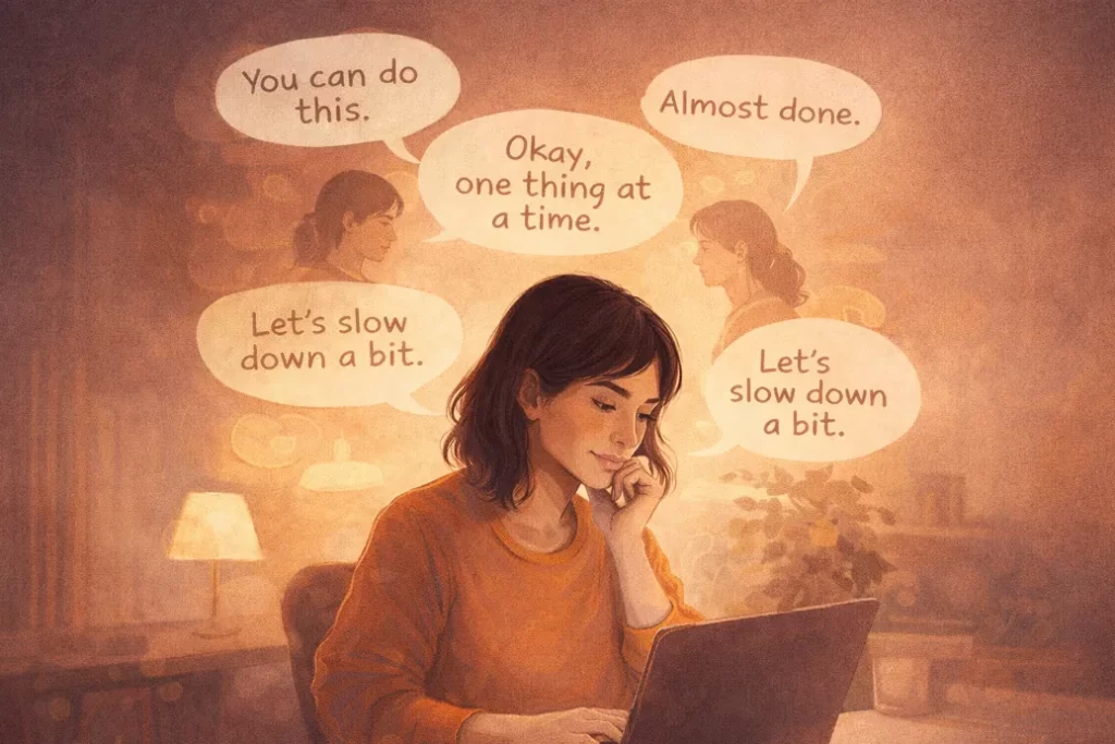 Therefore, talking to ourselves does not connote loneliness or weakness. It is thought in action It is the mind figuring out the experience, emotion, and decision in real time. And when that inner dialogue is gentle rather than harsh, it becomes a source of grounding instead of pressure.